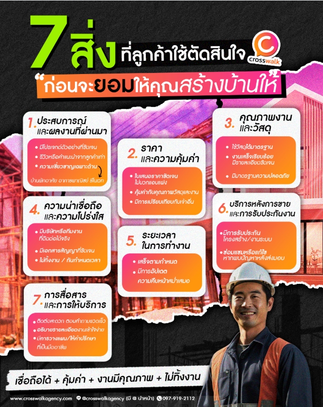 หากคุณกำลังมองหาวิธีโปรโมตธุรกิจรับเหมาก่อสร้างให้ได้ผล ไม่ว่าจะผ่านเว็บไซต์, Facebook, TikTok หรือช่องทางออนไลน์อื่นๆ “Crosswalk Agency” ยินดีช่วยวางกลยุทธ์การตลาด สร้างจุดแข็งของคุณให้โดดเด่นด้วยคอนเทนต์ที่ใช่ และกลยุทธ์การตลาดแบบครบวงจร พร้อมทีมงานมืออาชีพที่พร้อมดูแลคุณในทุกขั้นตอนแบบครบทีม!